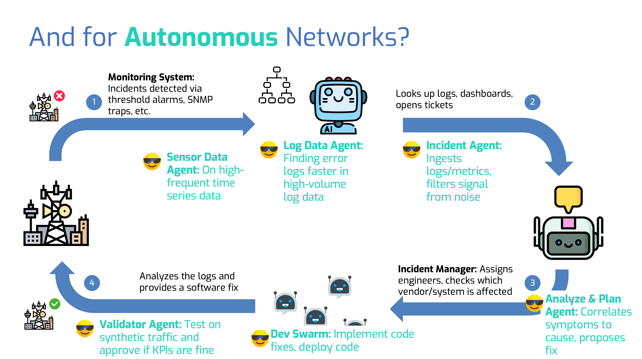 A few weeks ago, I stood in front of a telecommunication provider’s team, presenting an idea I’ve been passionate about: autonomous networks. Inspired by how manufacturing uses prescriptive maintenance to detect and resolve flaws, I envisioned networks that could autonomously detect incidents using agents, process sensor data, and solve problems through automated coding.